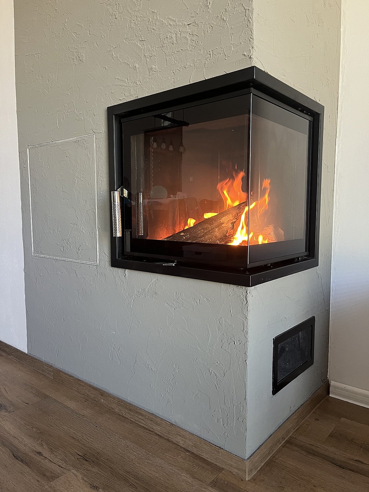 Rohová krbová vložka značky DEFRO. Obestavbu tvoří šamotové desky, finální úprava je designová betonová stěrka zhotovena majitelem.