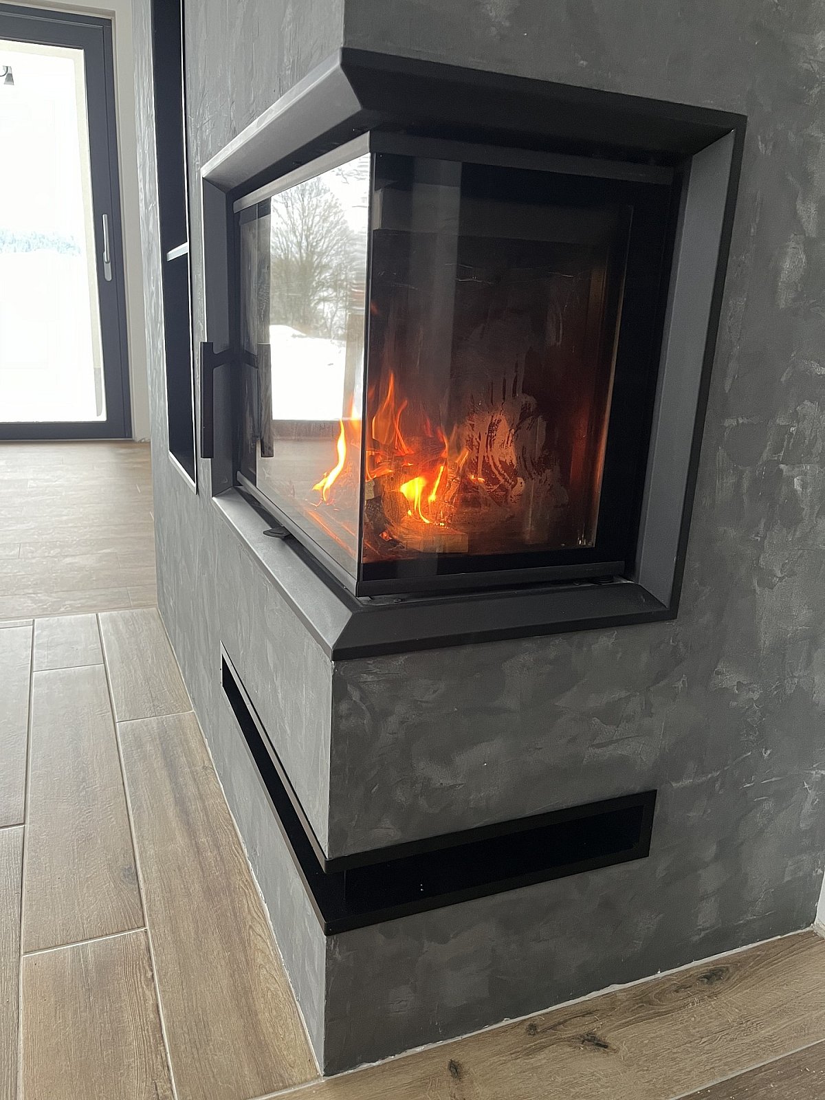 Rohové krbové vložky Romotop Heat s otevíráním do strany, kterou jsme realizovali v Kraslicích. Součást obestavby je železná nika na dřevo a finální úprava je betonová stěrka.